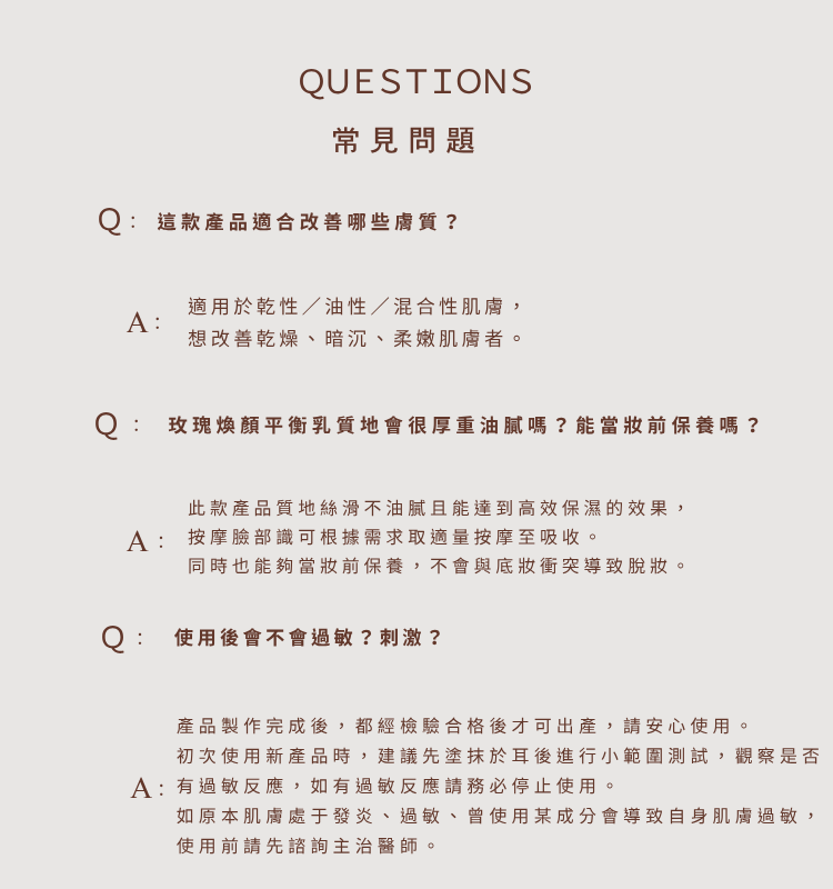 使用方式:取適量玫瑰煥顏平衡乳,輕輕塗抹於潔淨的面部與頸部,輕柔按摩至完全吸收。每日早晚使用,效果最佳,以保持肌膚最佳狀態。