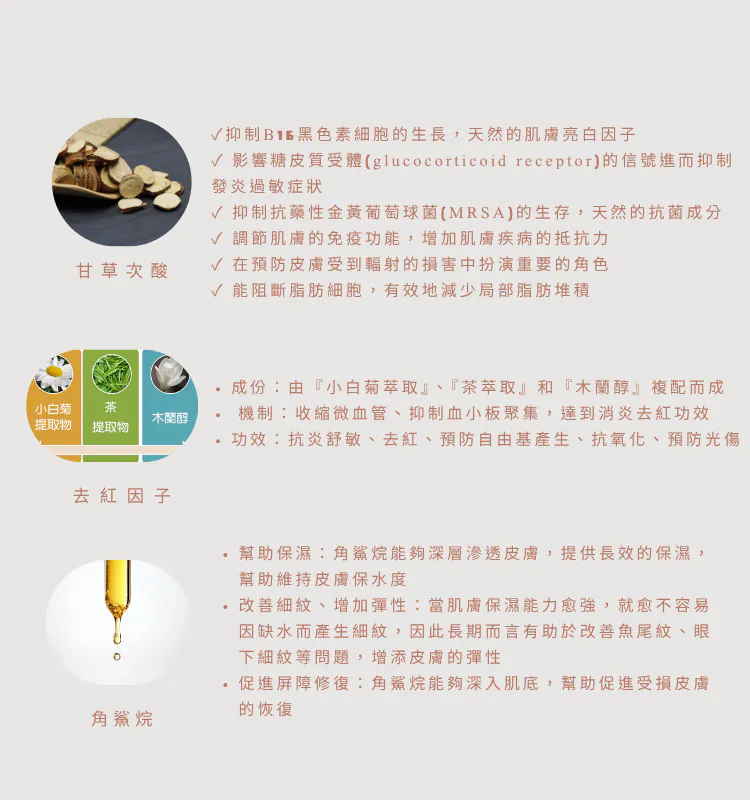 成分Ingredients :Water, Propanediol, Caprylic/Capric Triglyceride, Polyglyceryl‐3 Distearate, Coco‐caprylate/caprate, Isononyl Isononanoate, Squalane, Cetearyl Alcohol, Caprylyl Methicone, Glyceryl Stearate, Panthenol, Calcium Pantothenate, Chlorphenesin, Phenoxyethanol, Sodium Polyacryloyldimethyl Taurate, Polyacrylate Crosspolymer‐6, Sodium Benzoate, Chrysanthemum Parthenium Extract, Camellia Sinesis Extract, Lactococcus Ferment Lysate, Maltodextrin, Glyceryl Stearate Citrate, Butylene Glycol, Potassium Sorbate, Pentylene Glycol, Azelaic Acid, Allantoin, Sphingomonas Ferment Extract, Brassica Campestris (Rapeseed) Sterols, Glycyrrhetinic Acid, Caprylyl Glycol, Rosa Damascena Flower Water, Sodium Lauroyl Lactylate, Lecithin, Magnolol, Trisodium Citrate, Mentha piperita (Peppermint) Extract, T‐Butyl alcohol, Lactic Acid, Citric Acid, Ceramide NP, Sodium Chloride, Ceramide AP, Phytosphingosine, Cholesterol ,Phenylpropanol, Xanthan Gum, Carbomer, Ethylhexylglycerin, Cyanocobalamin, Levulinic Acid, Sodium Levulinate, Glycerin, Ceramide EOP.
