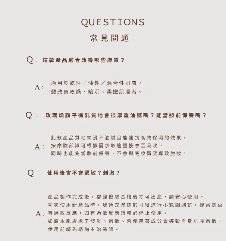 使用方式:取適量玫瑰煥顏平衡乳,輕輕塗抹於潔淨的面部與頸部,輕柔按摩至完全吸收。每日早晚使用,效果最佳,以保持肌膚最佳狀態。